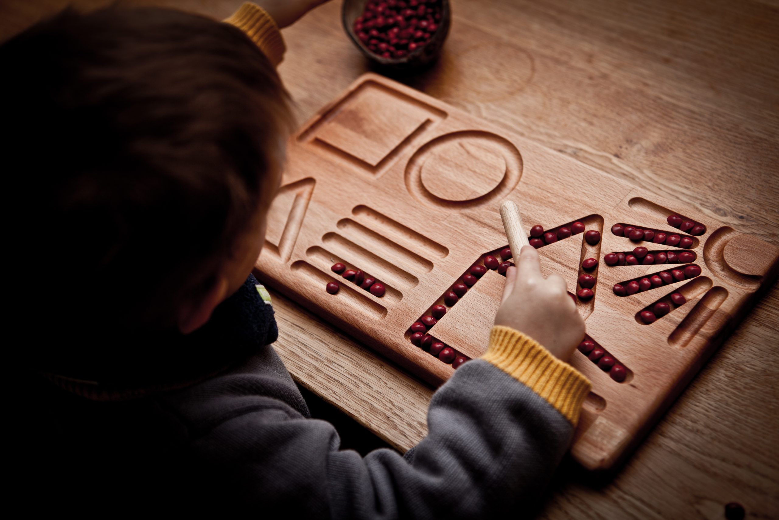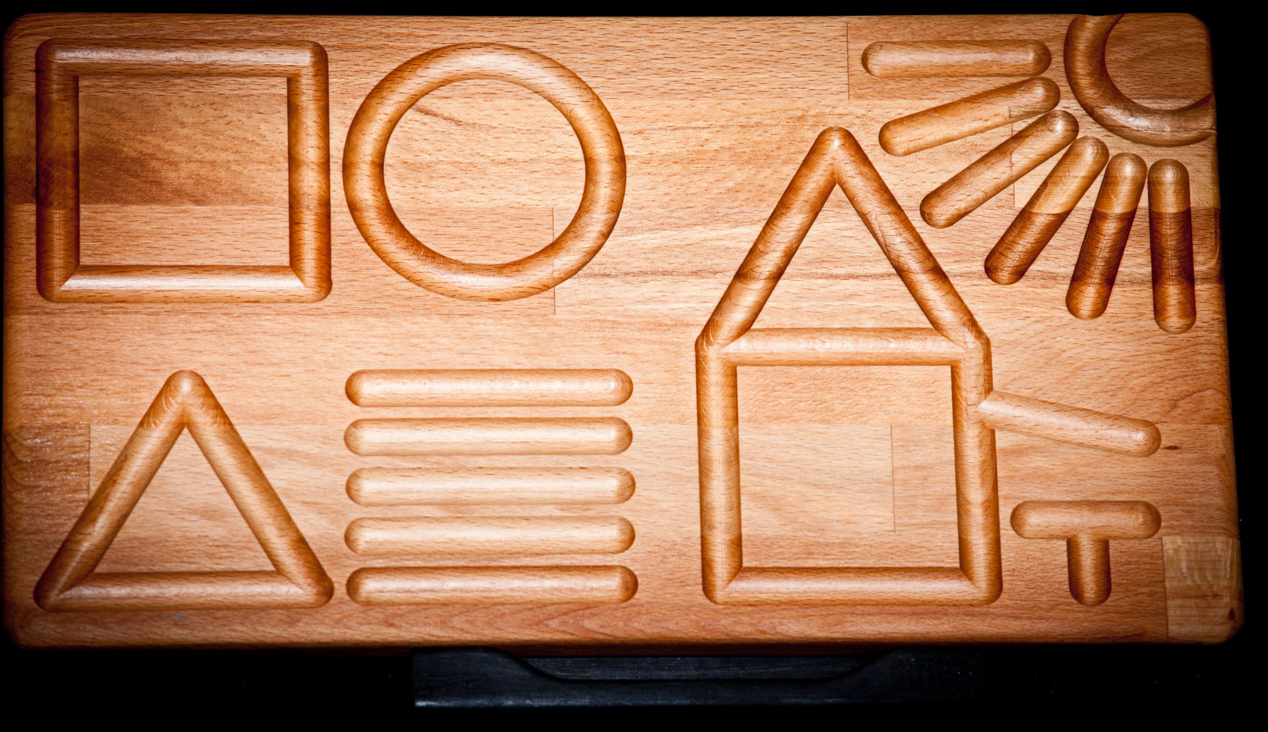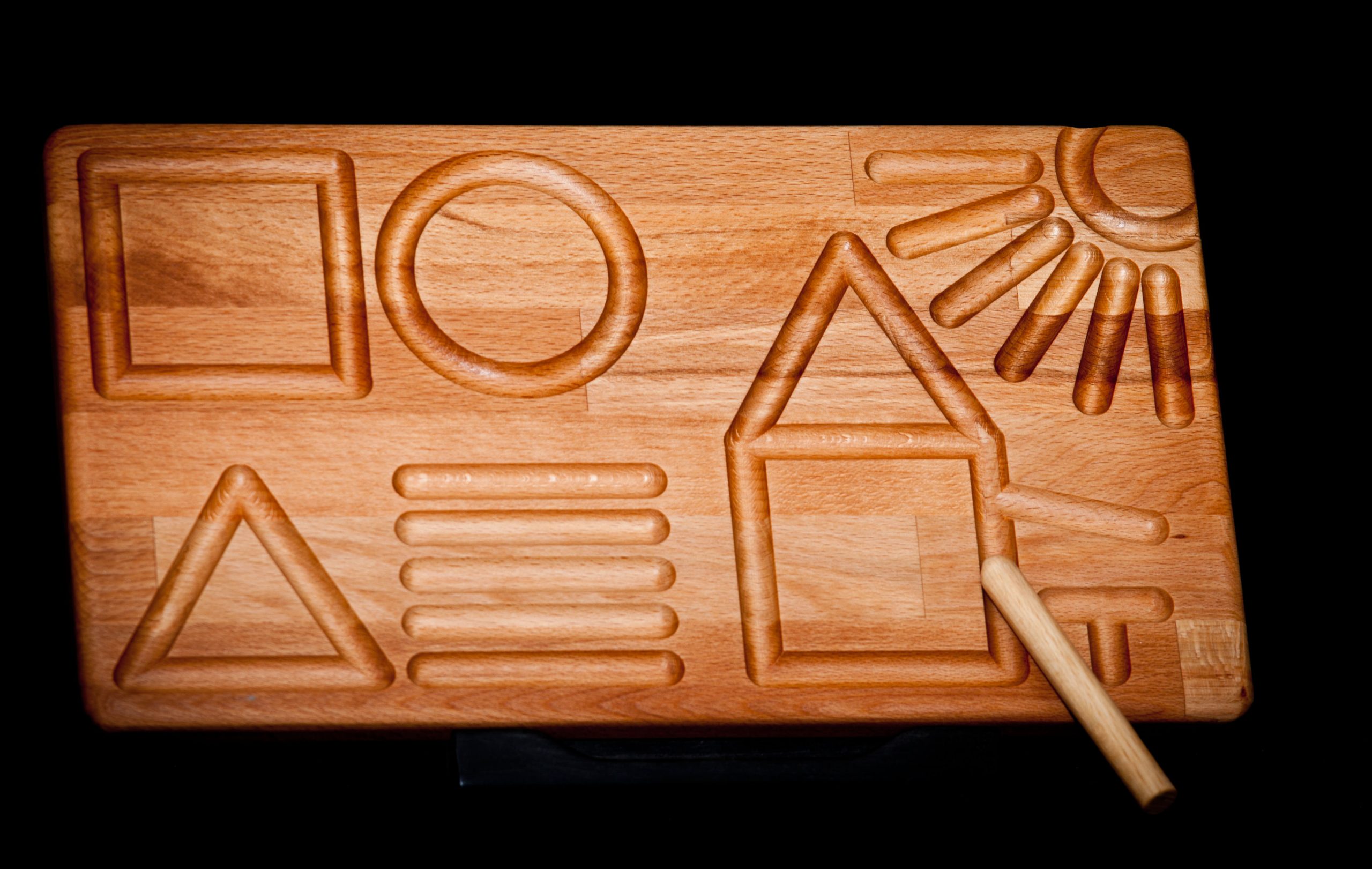 Dieses Brett hilft Deinem Kind durch Nachzeichnen der Vertiefungen in der Holzoberfläche, Kurven, gerade Linien, Winkel und Muster zu üben.