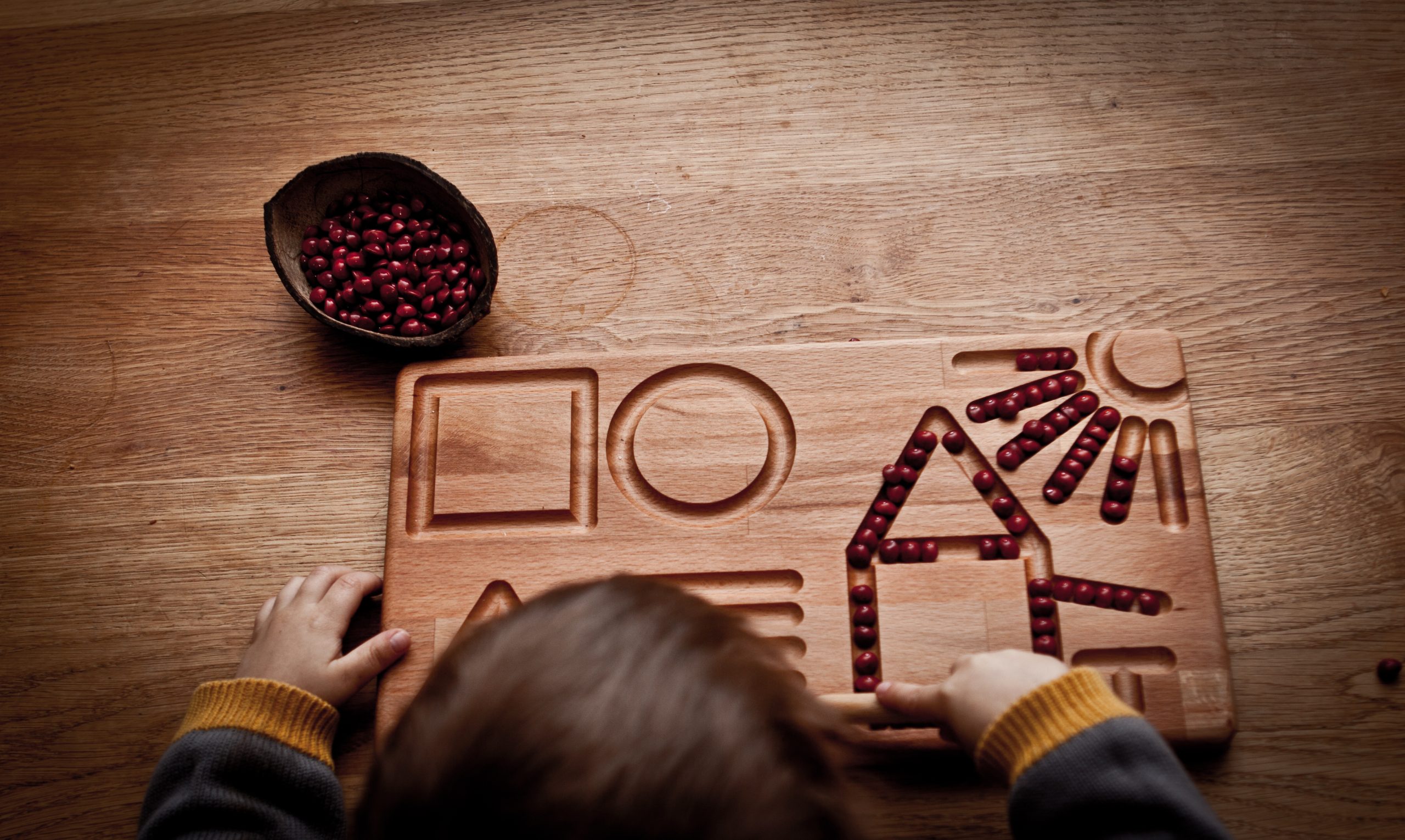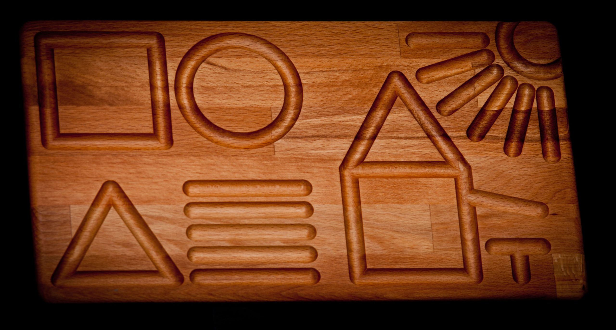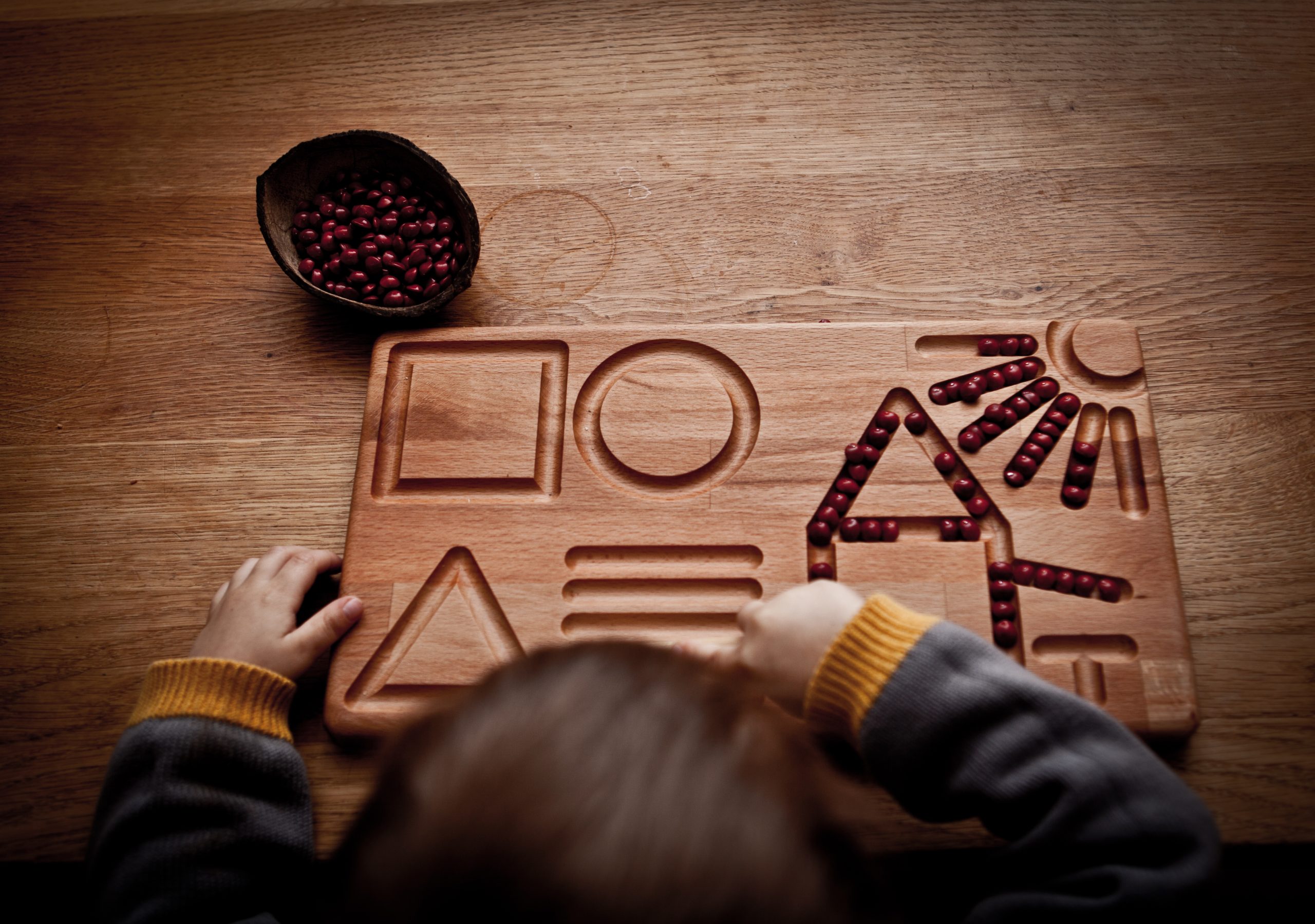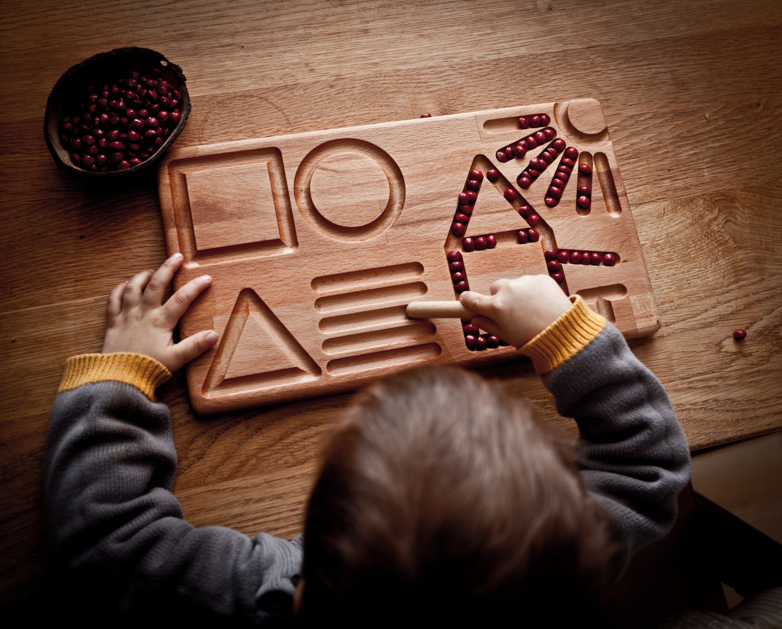 Dieses Brett hilft Deinem Kind durch Nachzeichnen der Vertiefungen in der Holzoberfläche, Kurven, gerade Linien, Winkel und Muster zu üben.