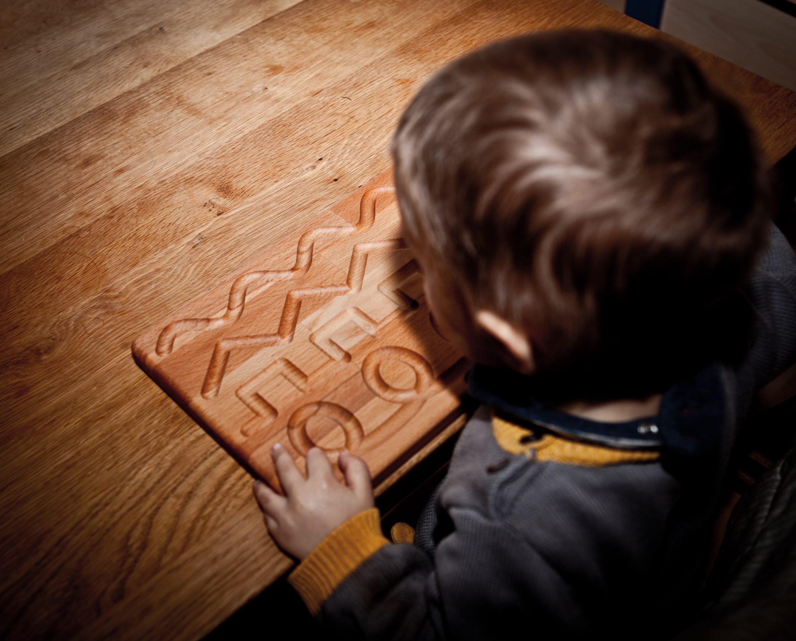 Das Kind führt die Hand entlang der gravierten Linie beim Tippen mit einem Stab oder einem Finger.
