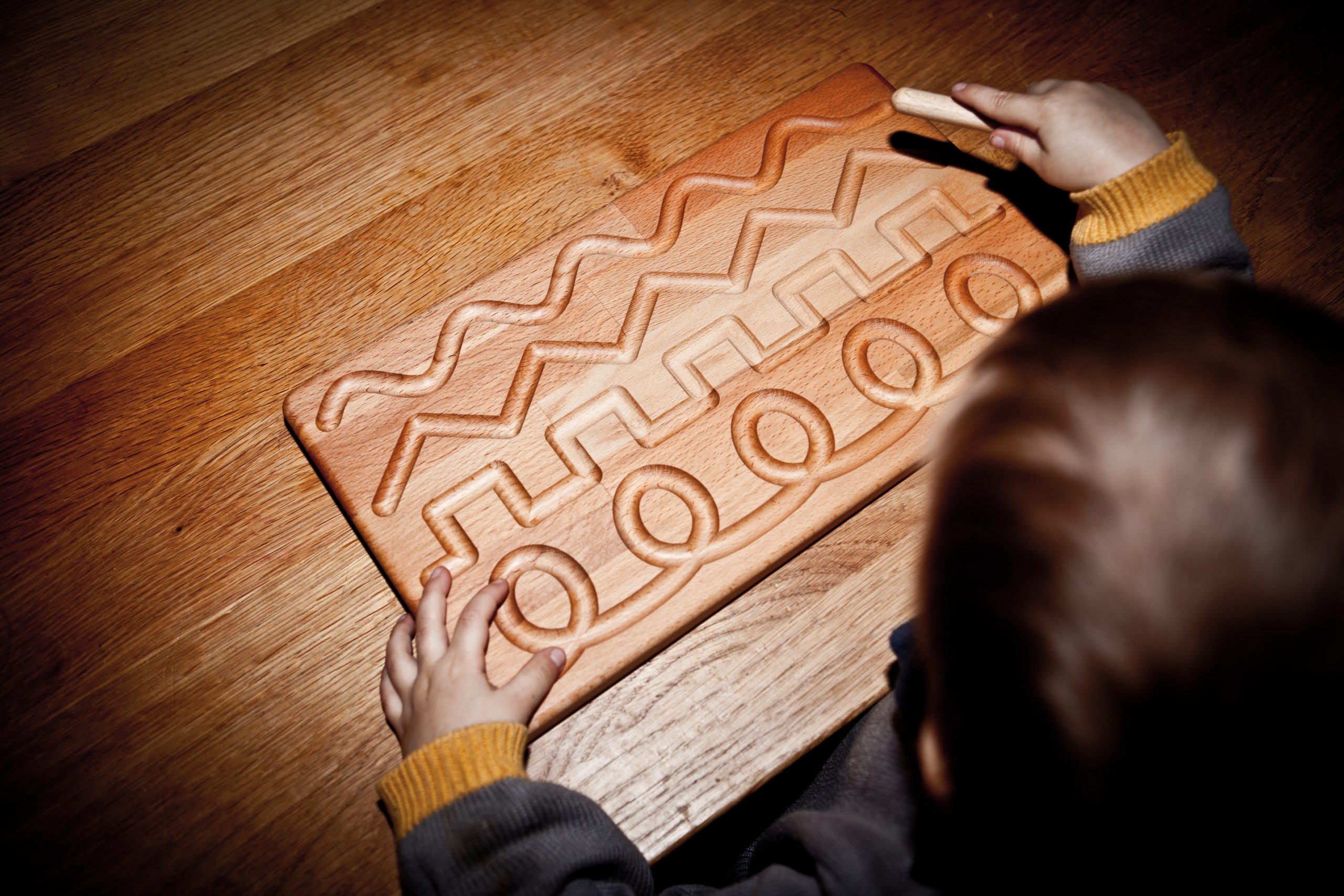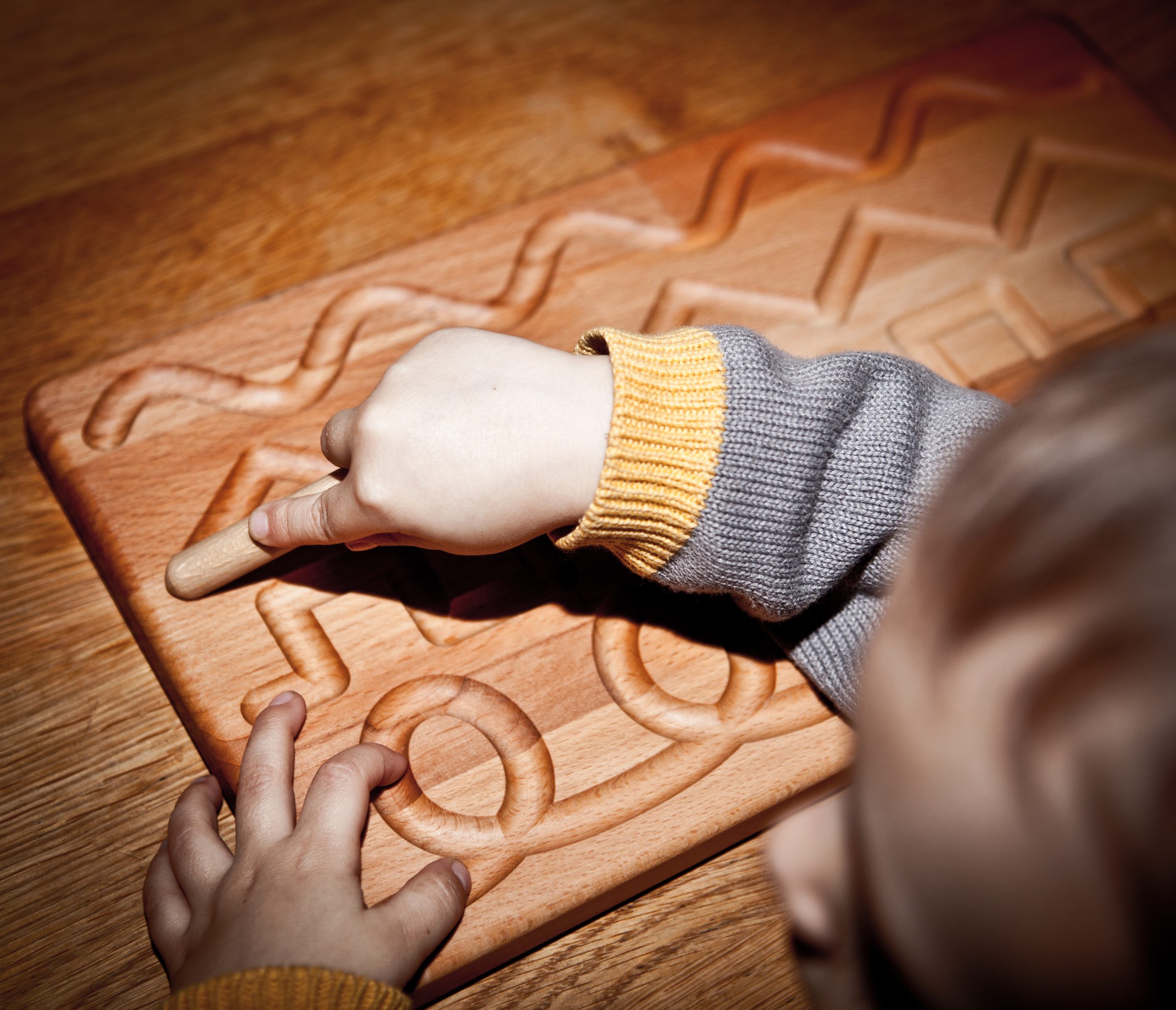 Dieses Brett hilft Deinem Kind durch Nachzeichnen der Vertiefungen in der Holzoberfläche, Kurven, gerade Linien, Winkel und Muster zu üben.